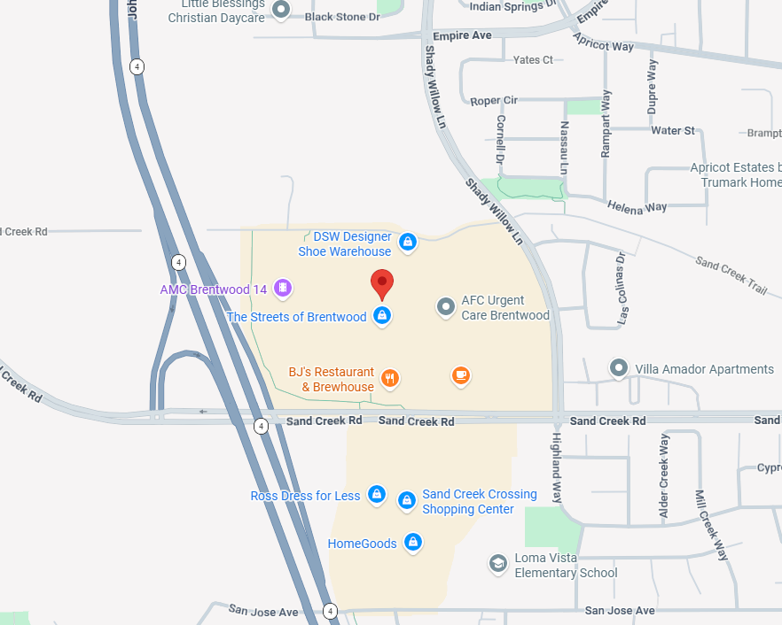 Address: 2565 Sand Creek Rd, Ste 136 Brentwood, CA 94513 (The Streets of Brentwood) Hours: Monday – Saturday: 11:00 AM – 6:00 PM Sunday: 11:00 AM – 5:00 PM Phone: (925) 634-0718